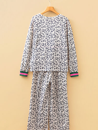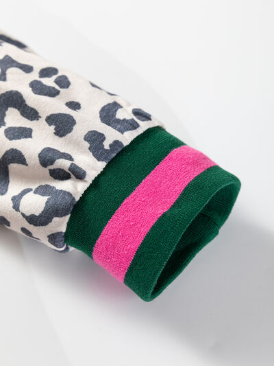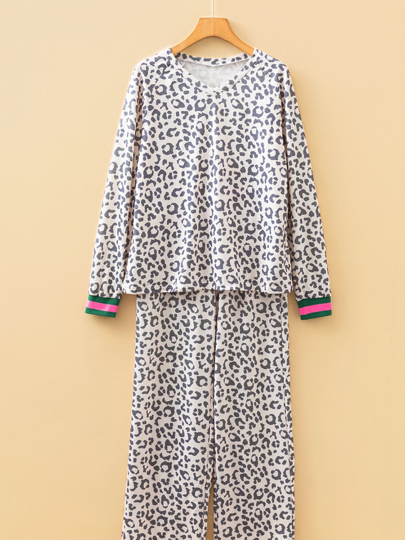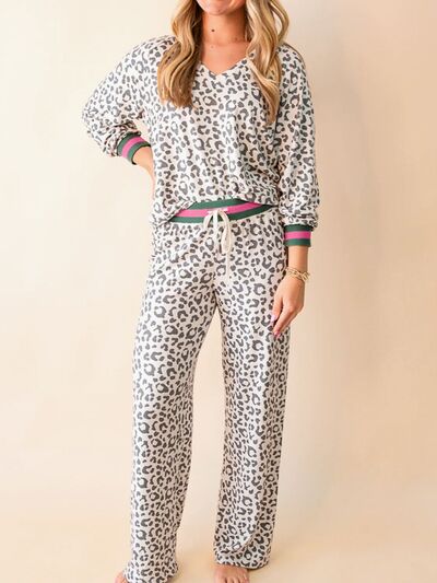 V Neck Leopard Long Sleeve Top Striped Webbing Patchwork Drawstring Pant Set