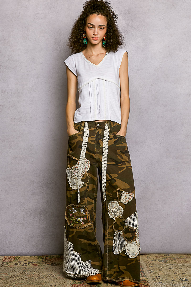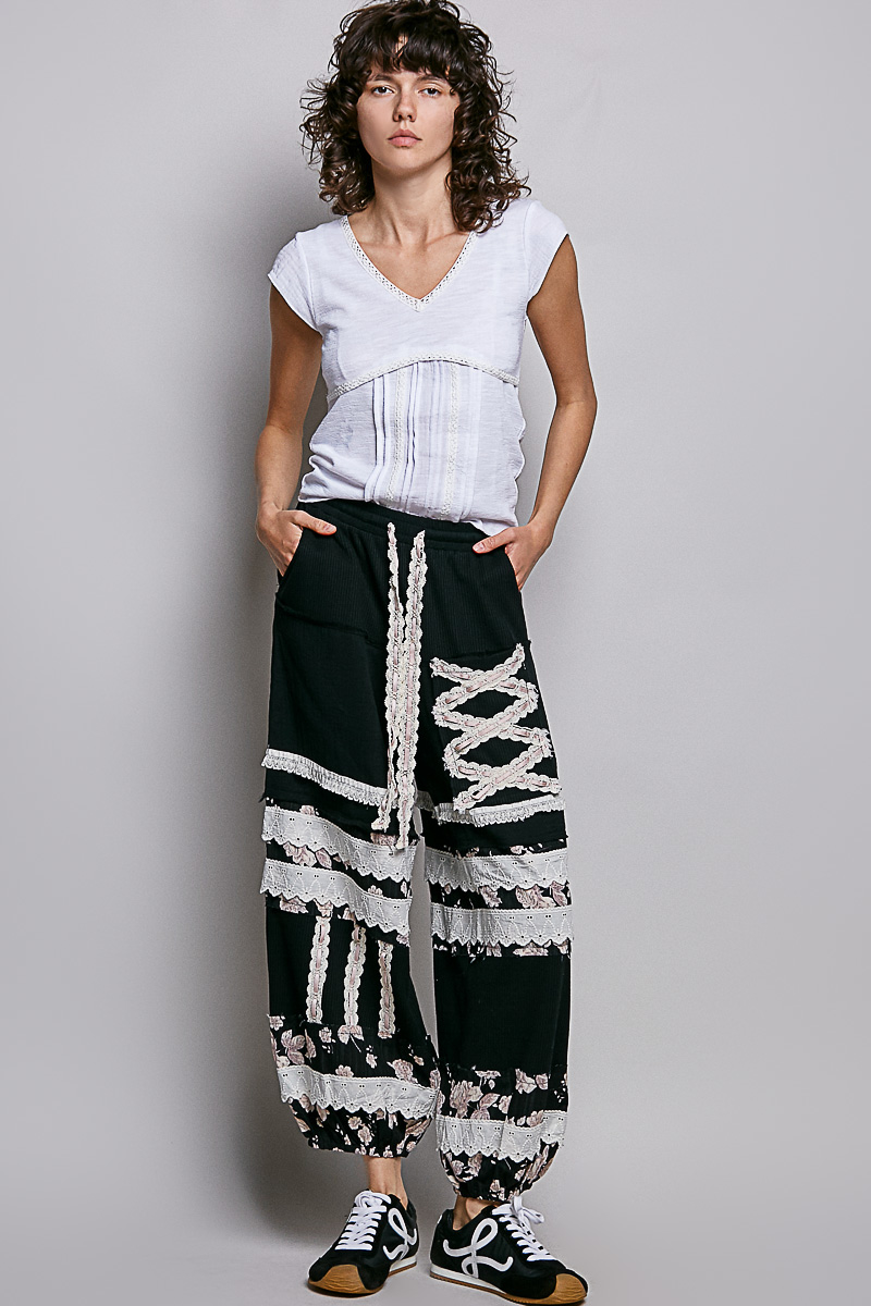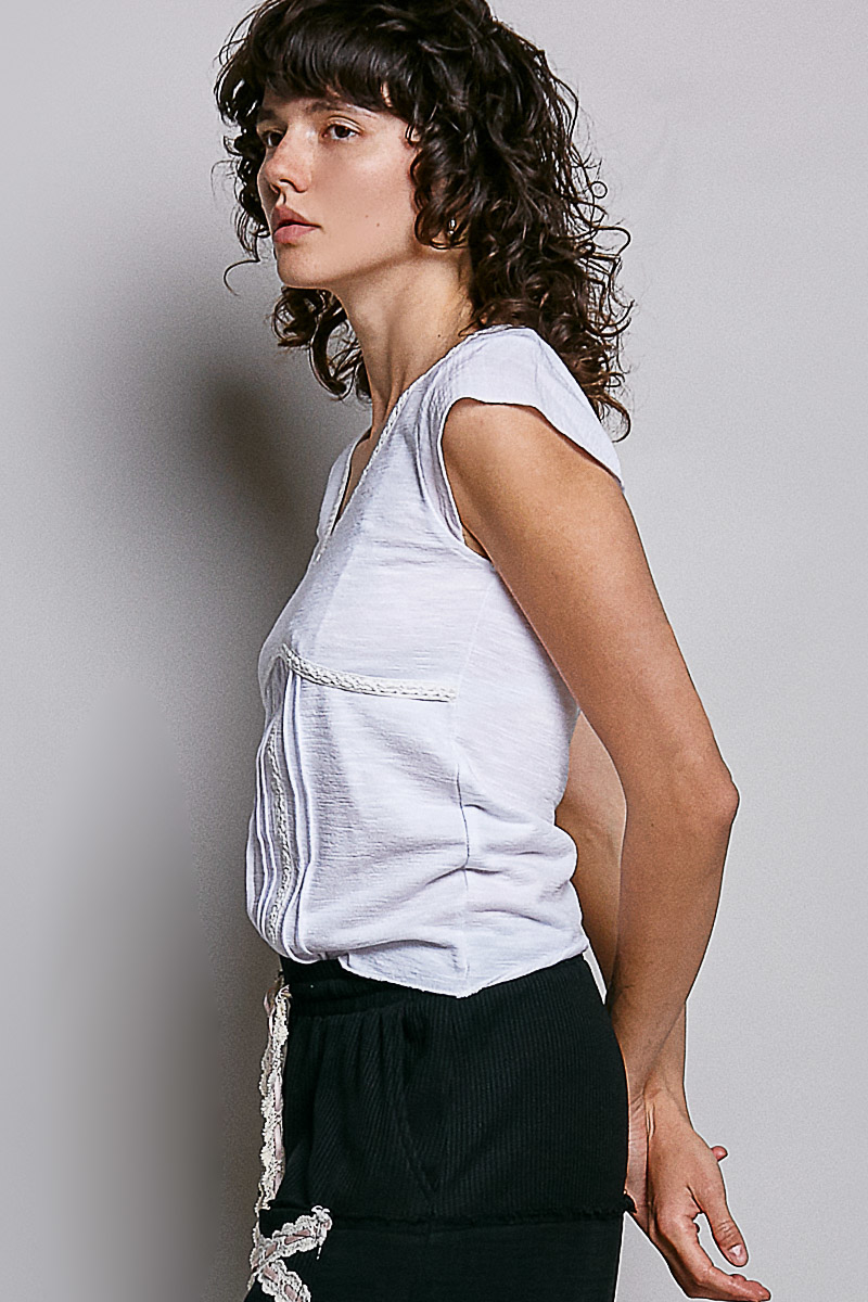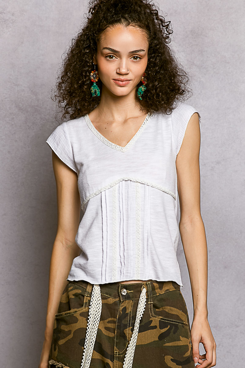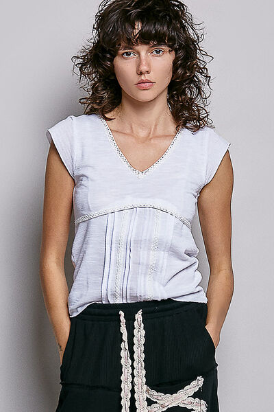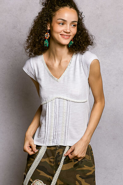 V-Neck Lightweight Textured Short Sleeve Knit Top with Lace Trim