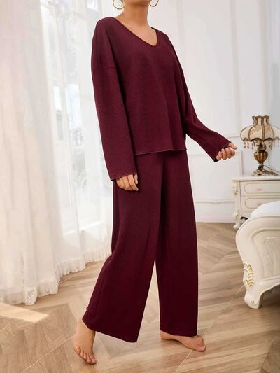 V-Neck Long Sleeve Top and Wide Leg Pants Set