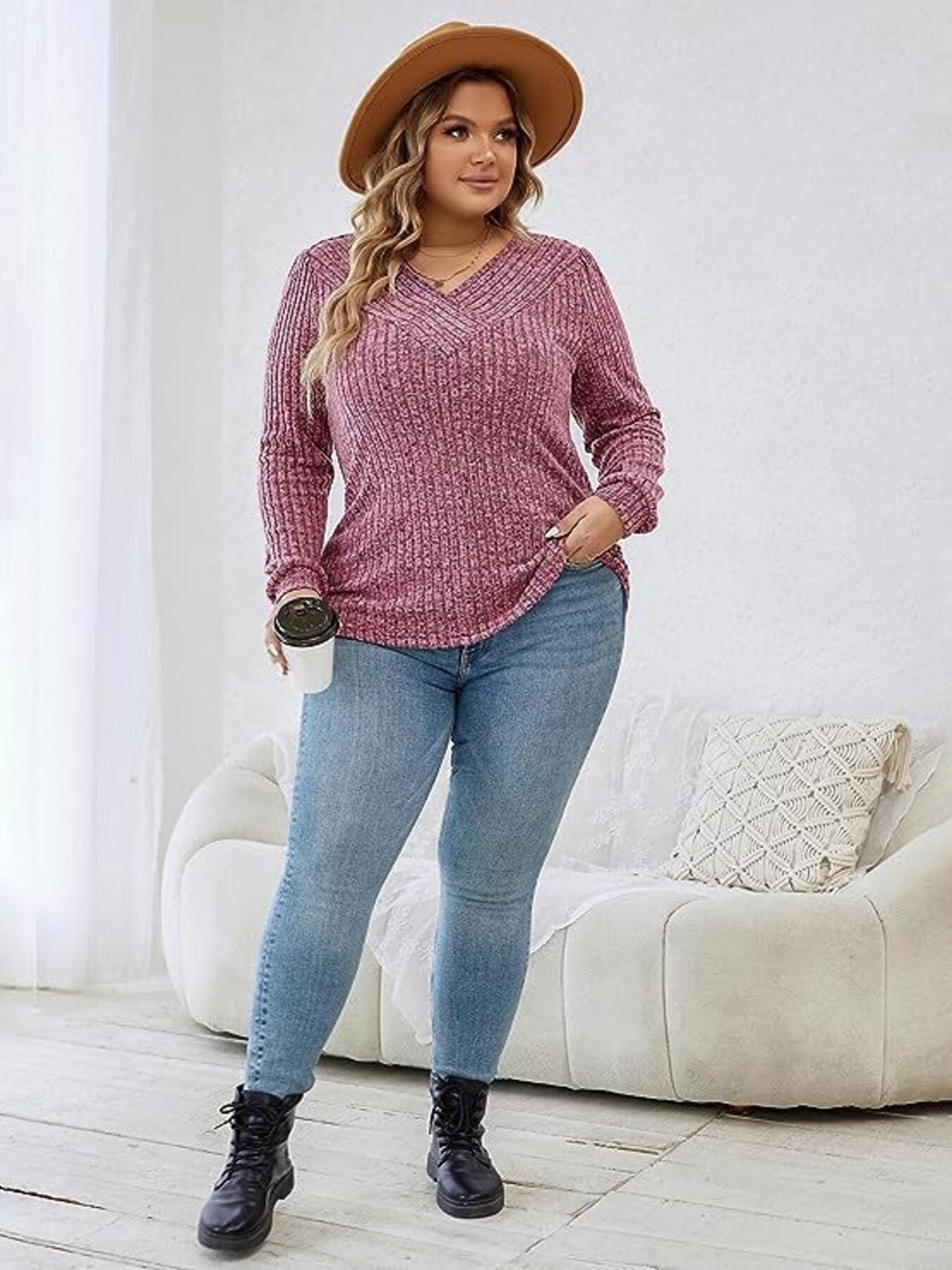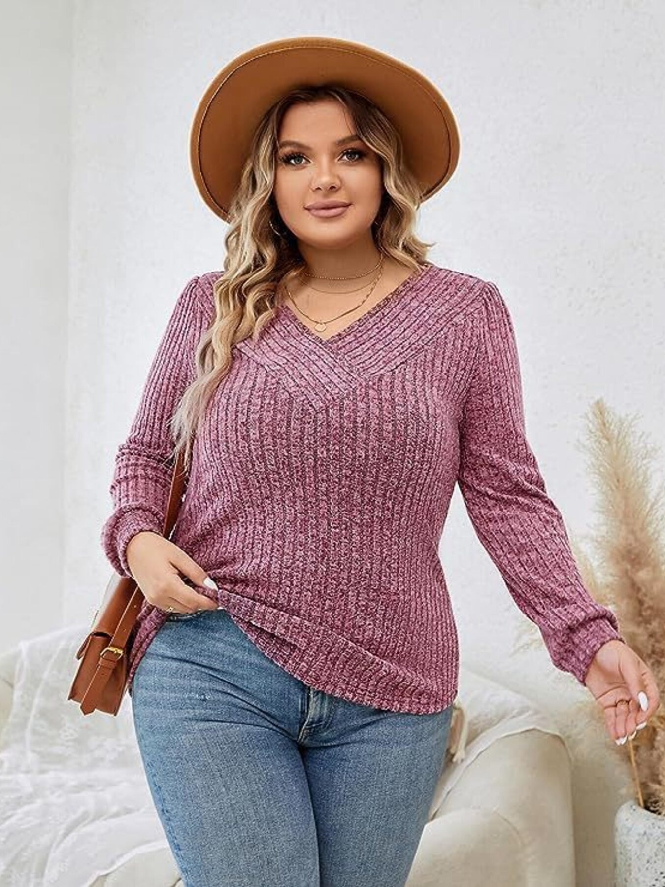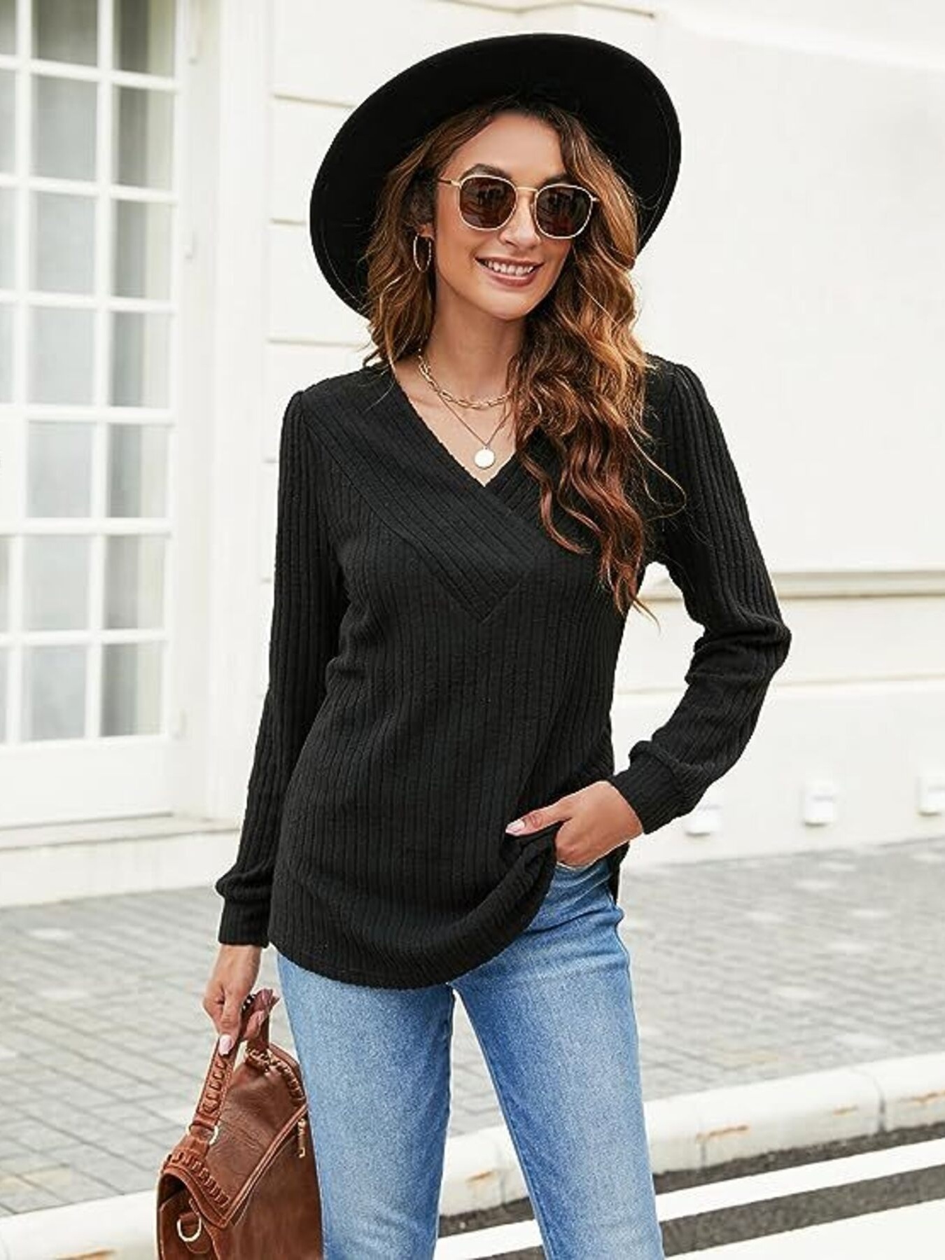 V-Neck Ribbed Long Sleeve Knit Top