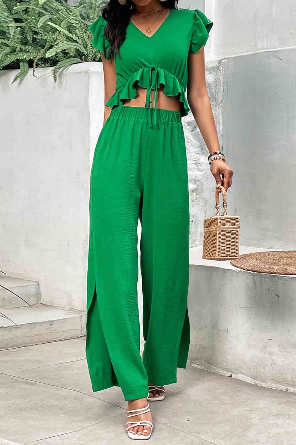 V-Neck Ruffle Hem Top and Slit Pants Set