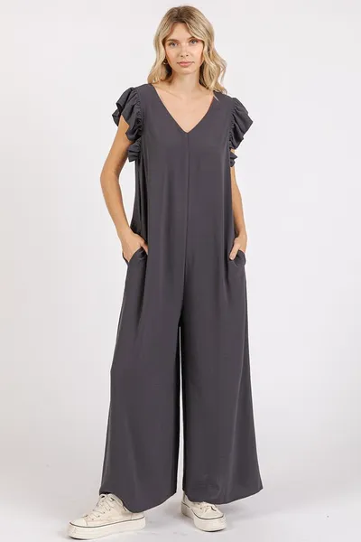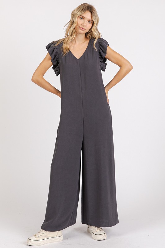 V-Neck Ruffled Cap Sleeve Wide Leg Jumpsuit