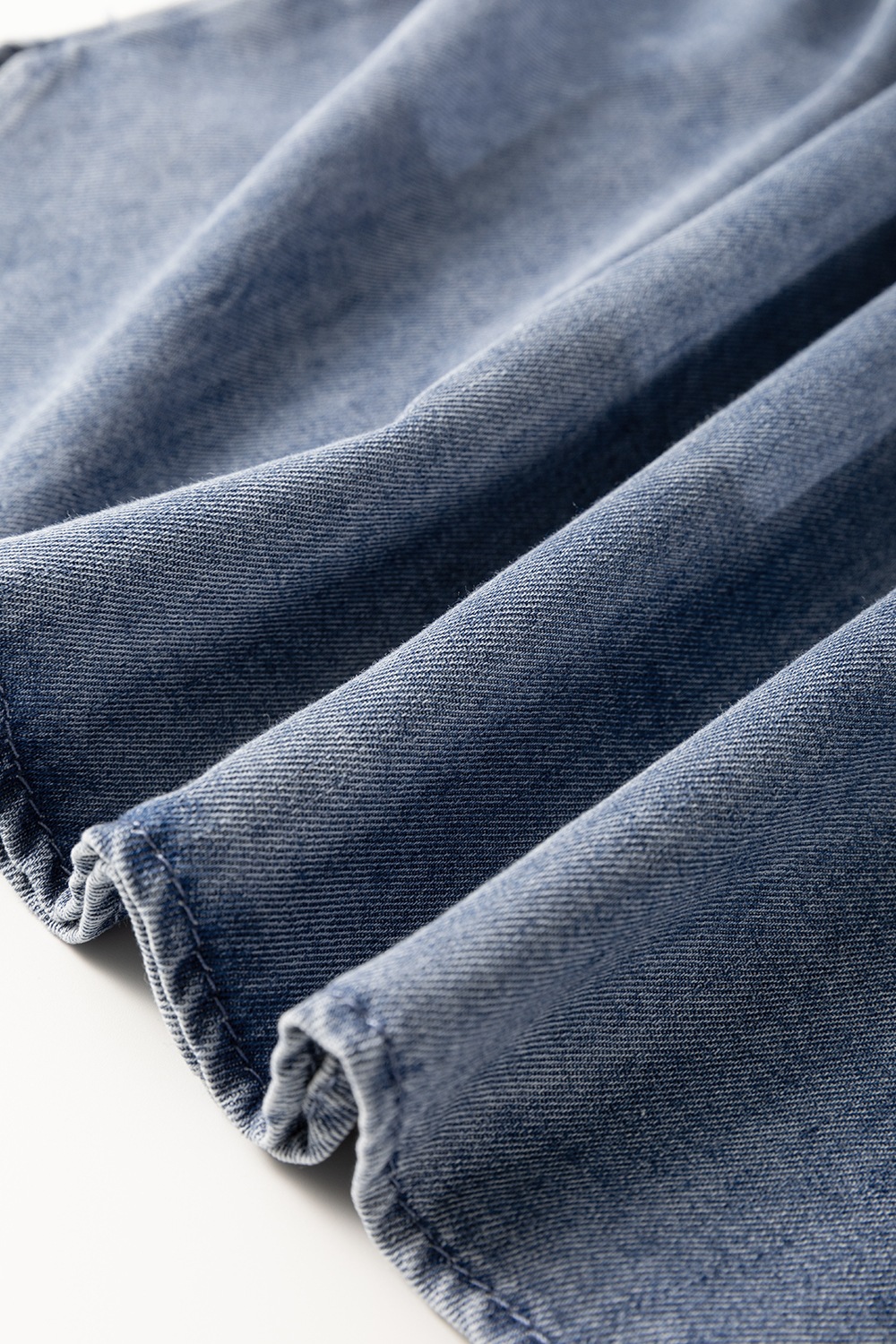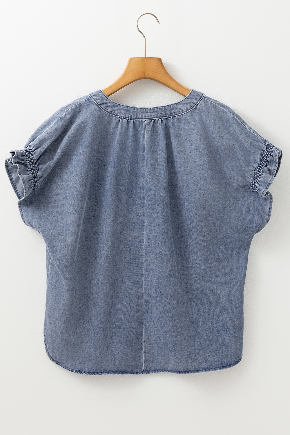 V Neck Ruffled Short Puff Sleeve Denim Top