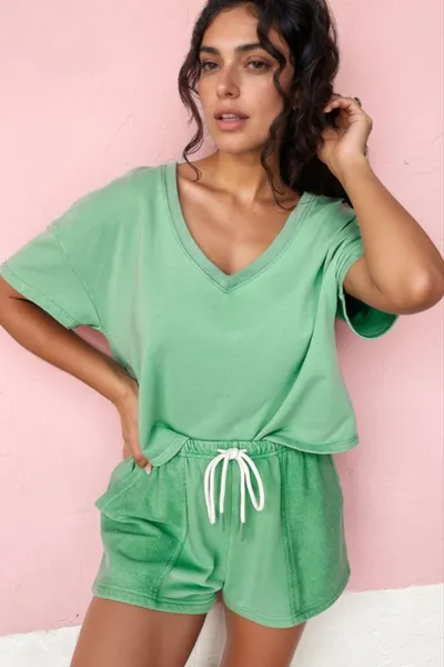 V-Neck Short Sleeve Loose Top and Drawstring Shorts Set
