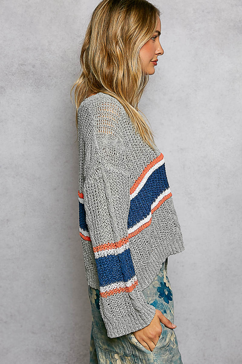 V-Neck Striped Pattern Cropped Knit Top with Cable Knit Detail