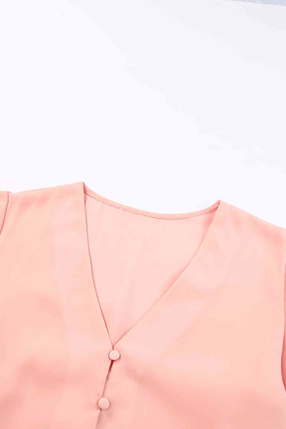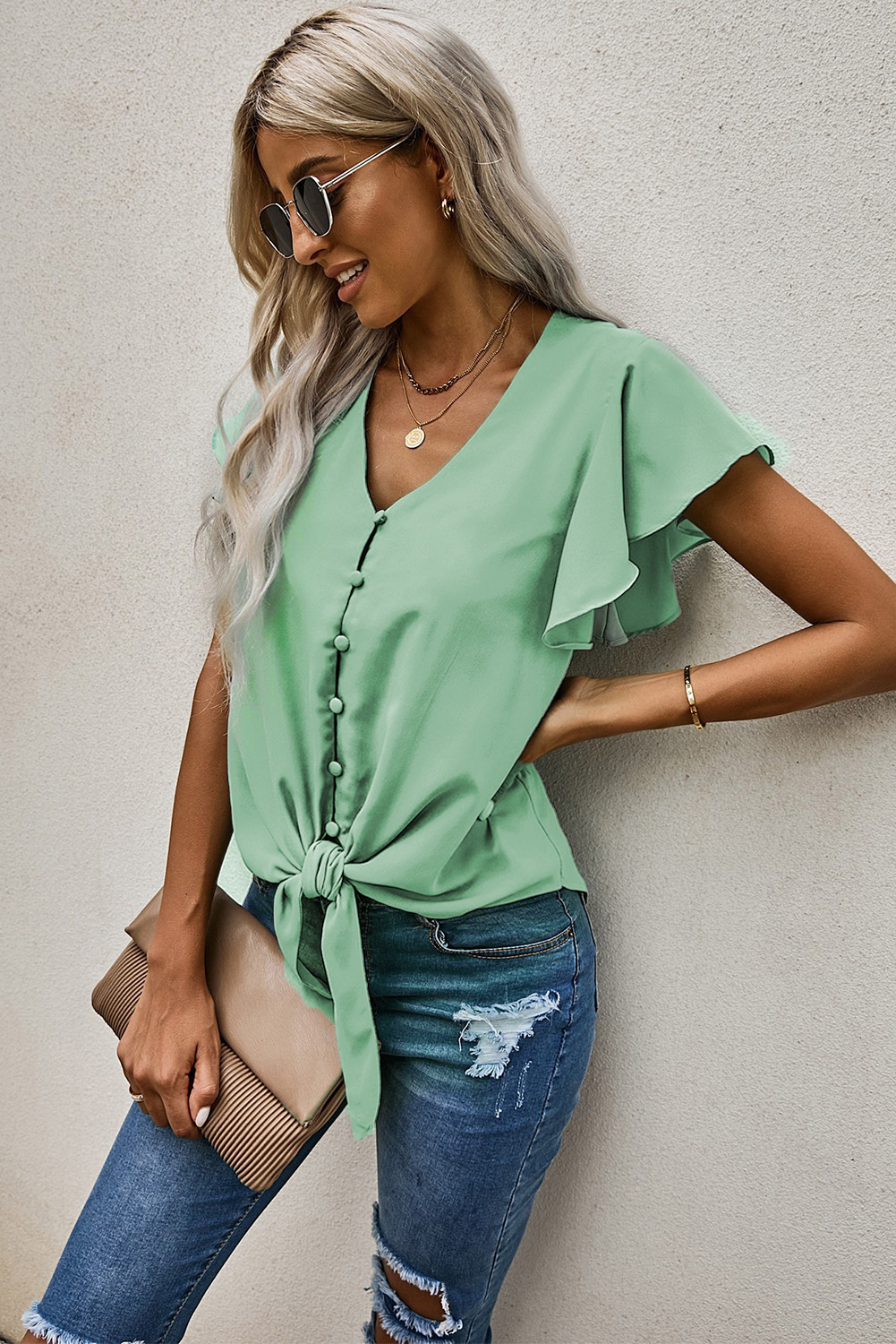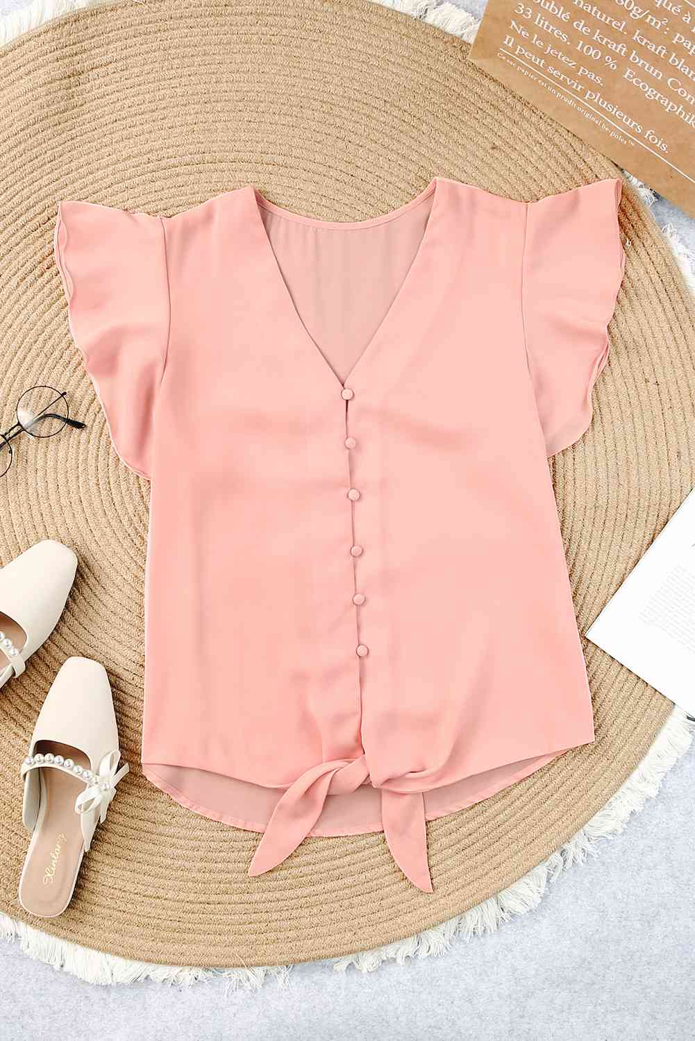 V-Neck Tie Hem Flutter Sleeve Blouse