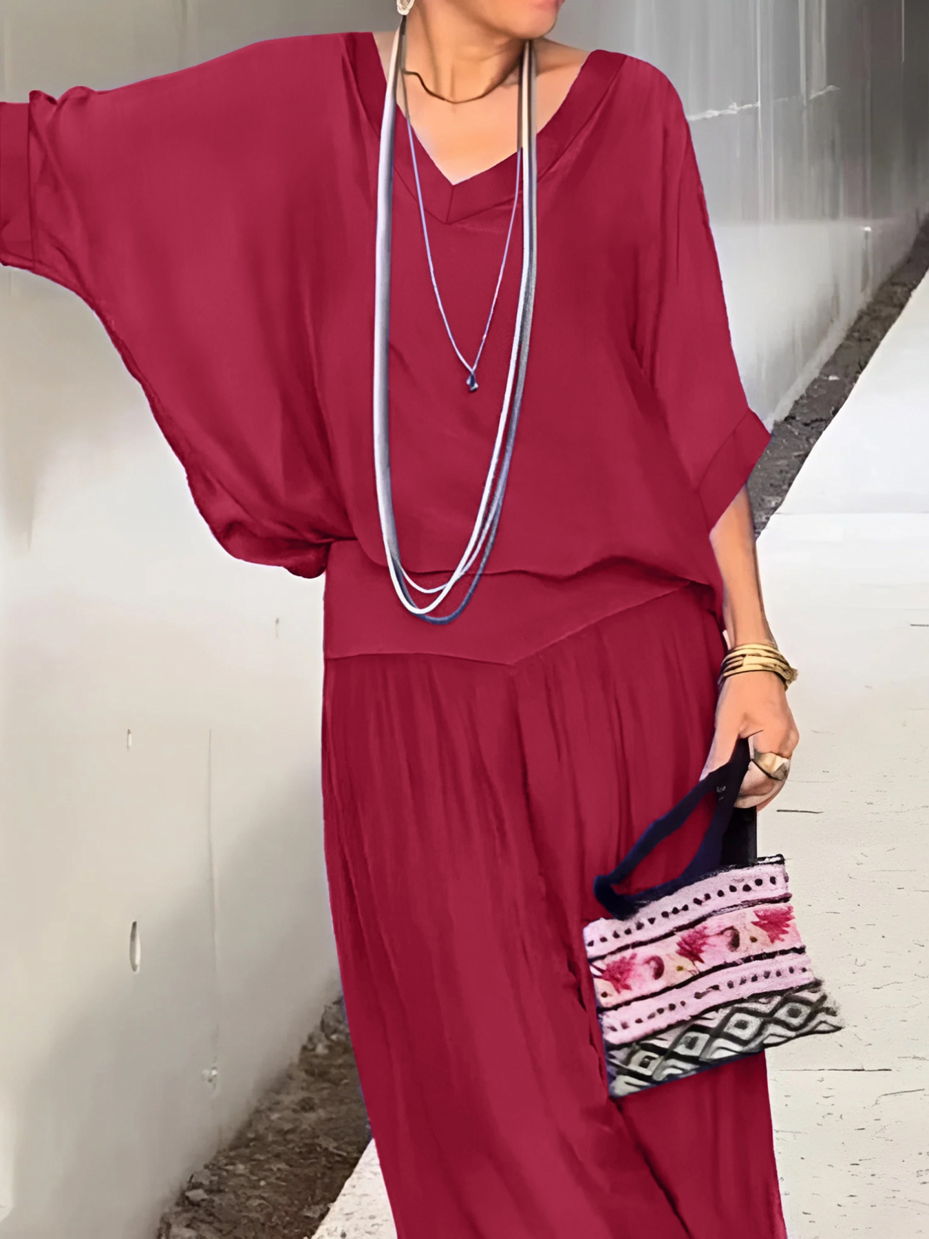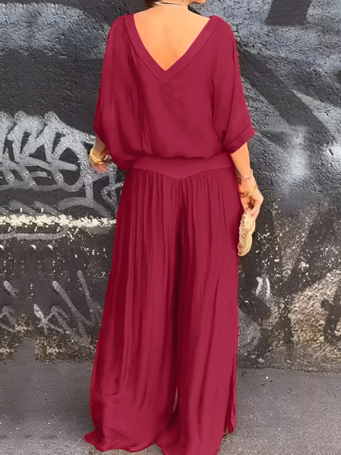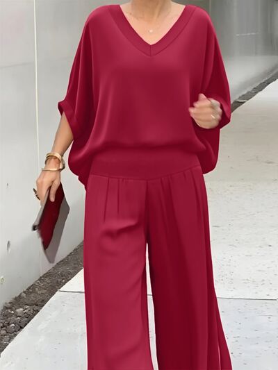 V-Neck Top and Wide Leg Pants Two-Piece Set