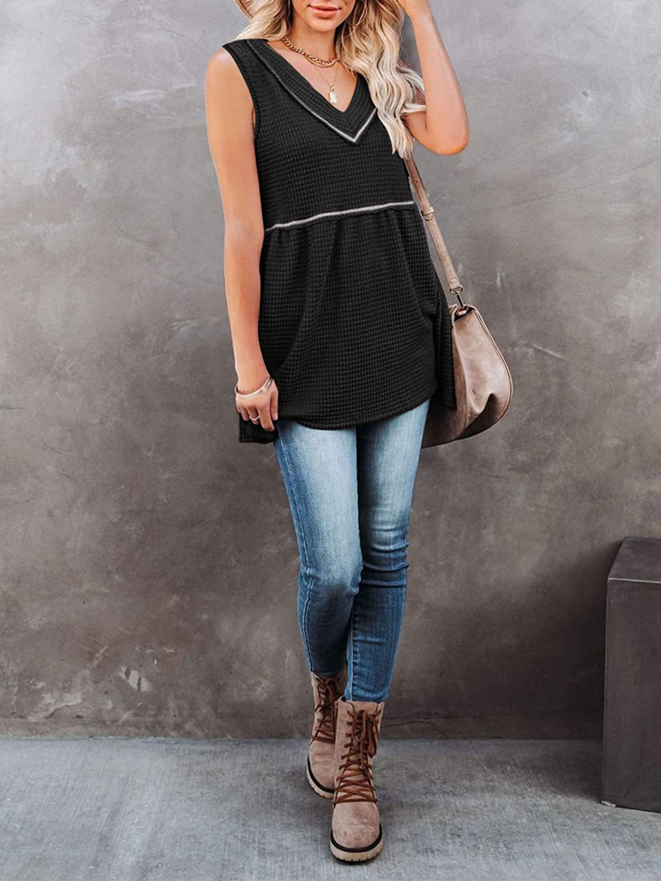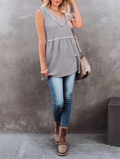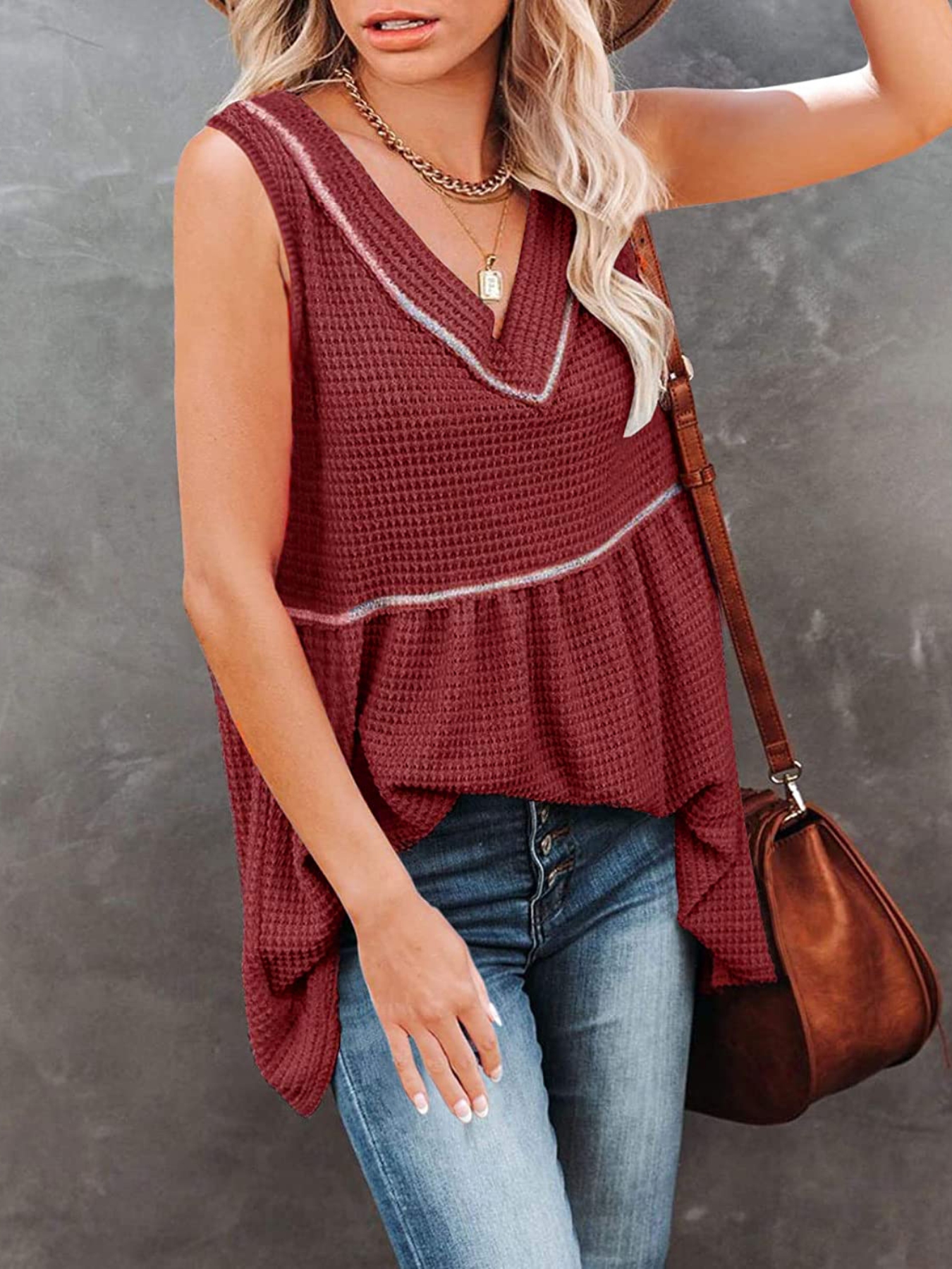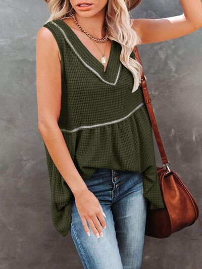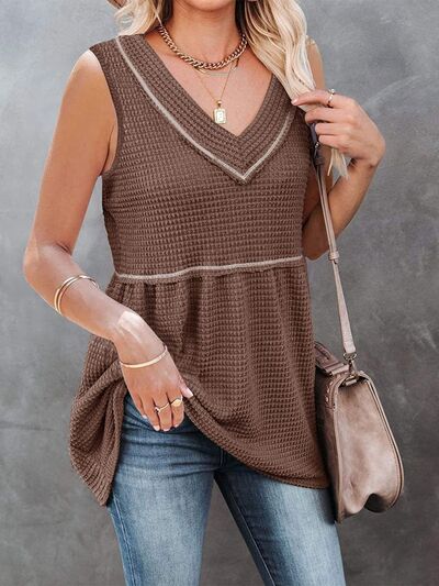 V-Neck Waffle Knit Tank Top with Contrast Stitching