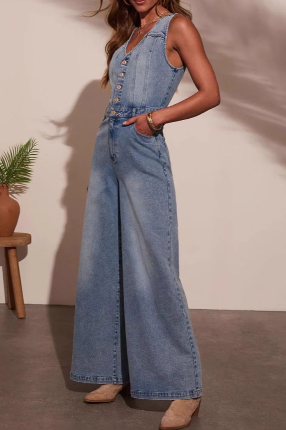 V-neck Wide Leg Denim Jumpsuit