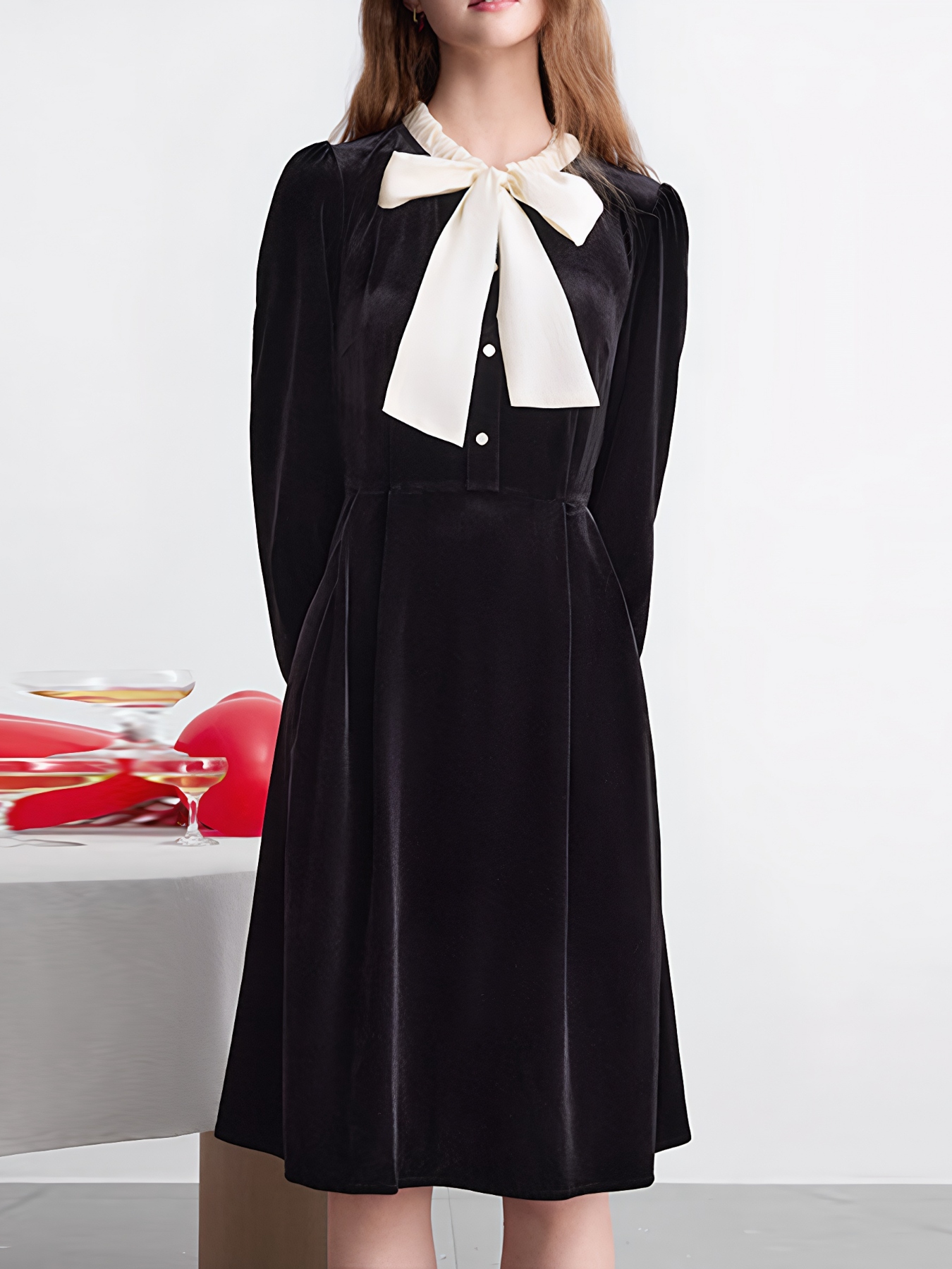 Velvet Bowknot Long Sleeve A-Line Dress