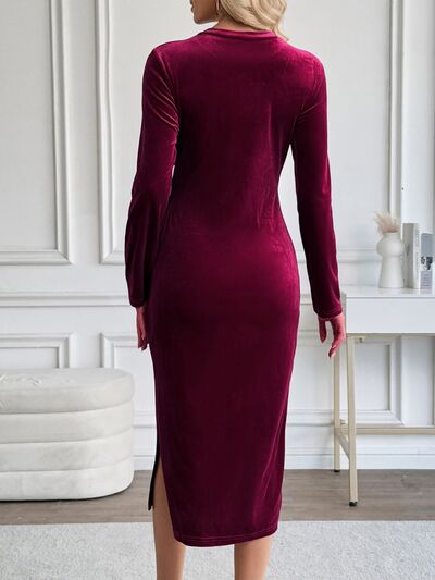 Velvet Slit Round Neck Long Sleeve Dress with Side Tie Detail