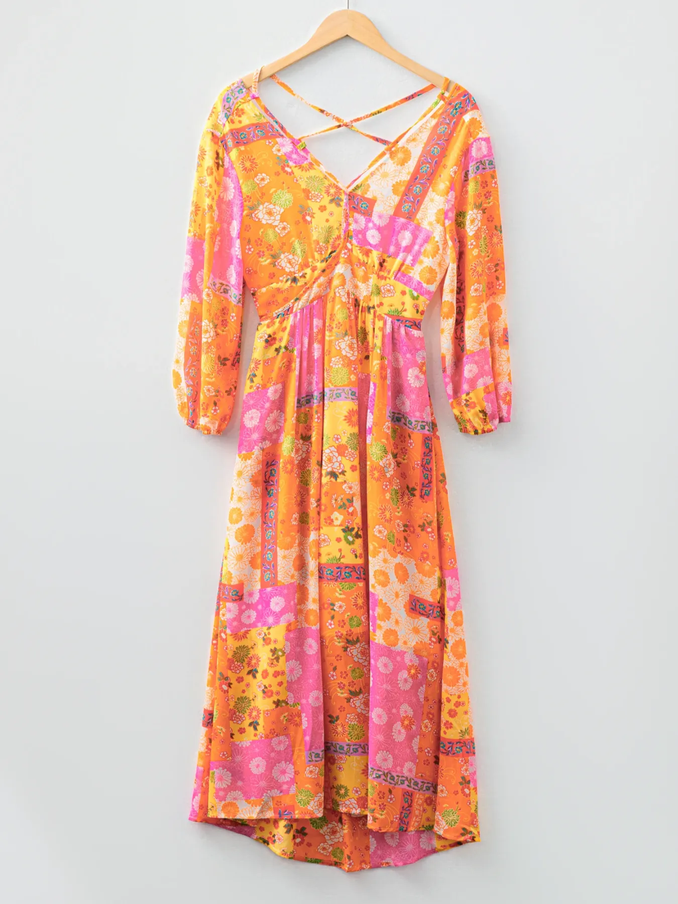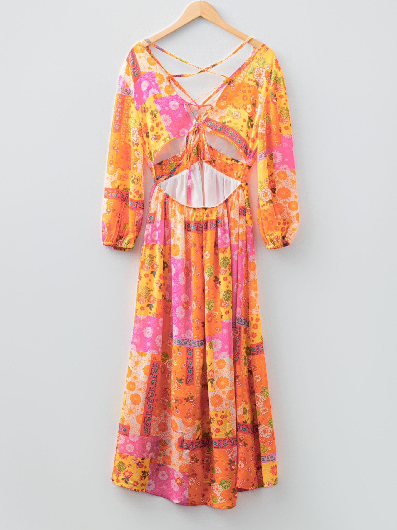 Vibrant Floral Long Sleeve Dress with Lace-Up Back