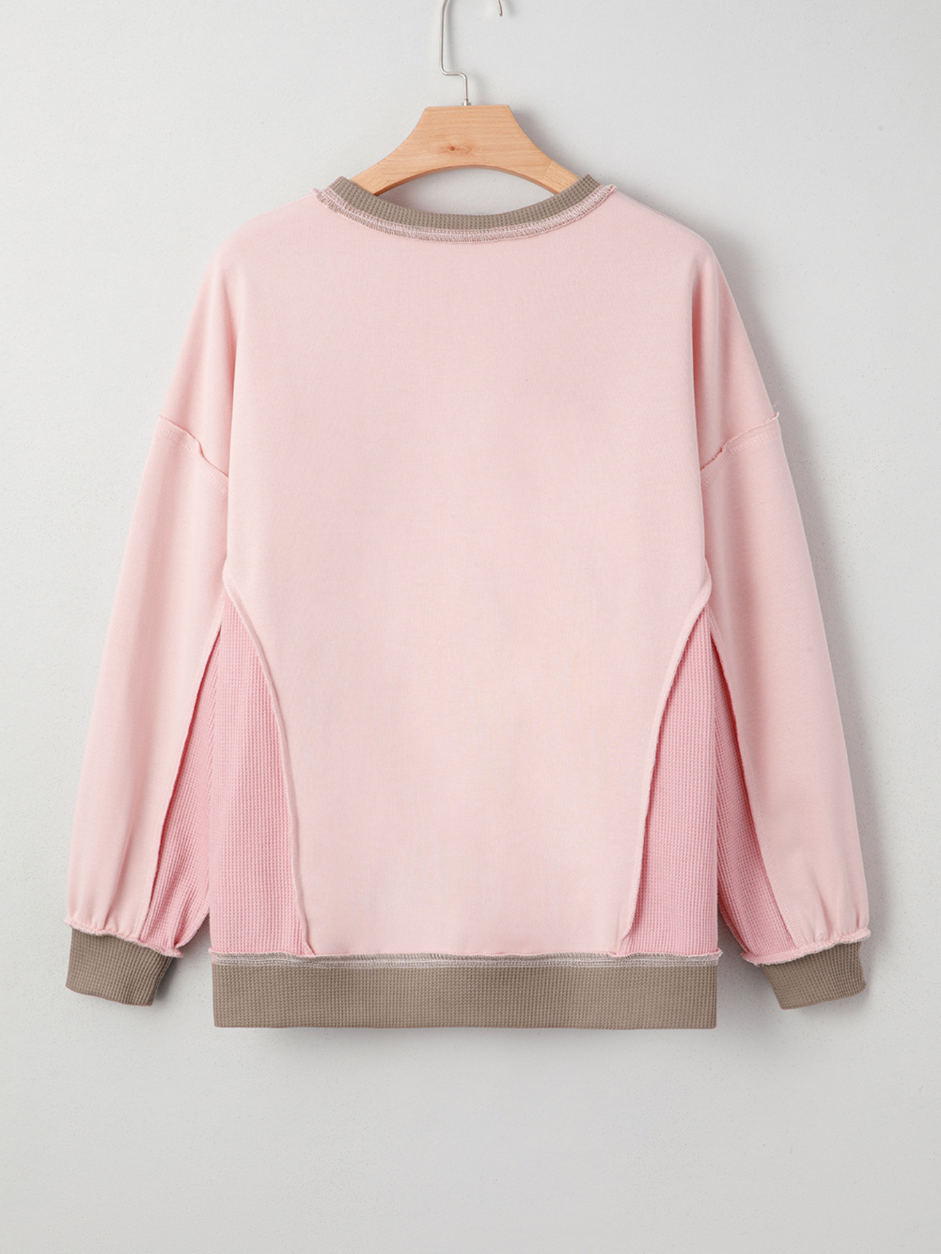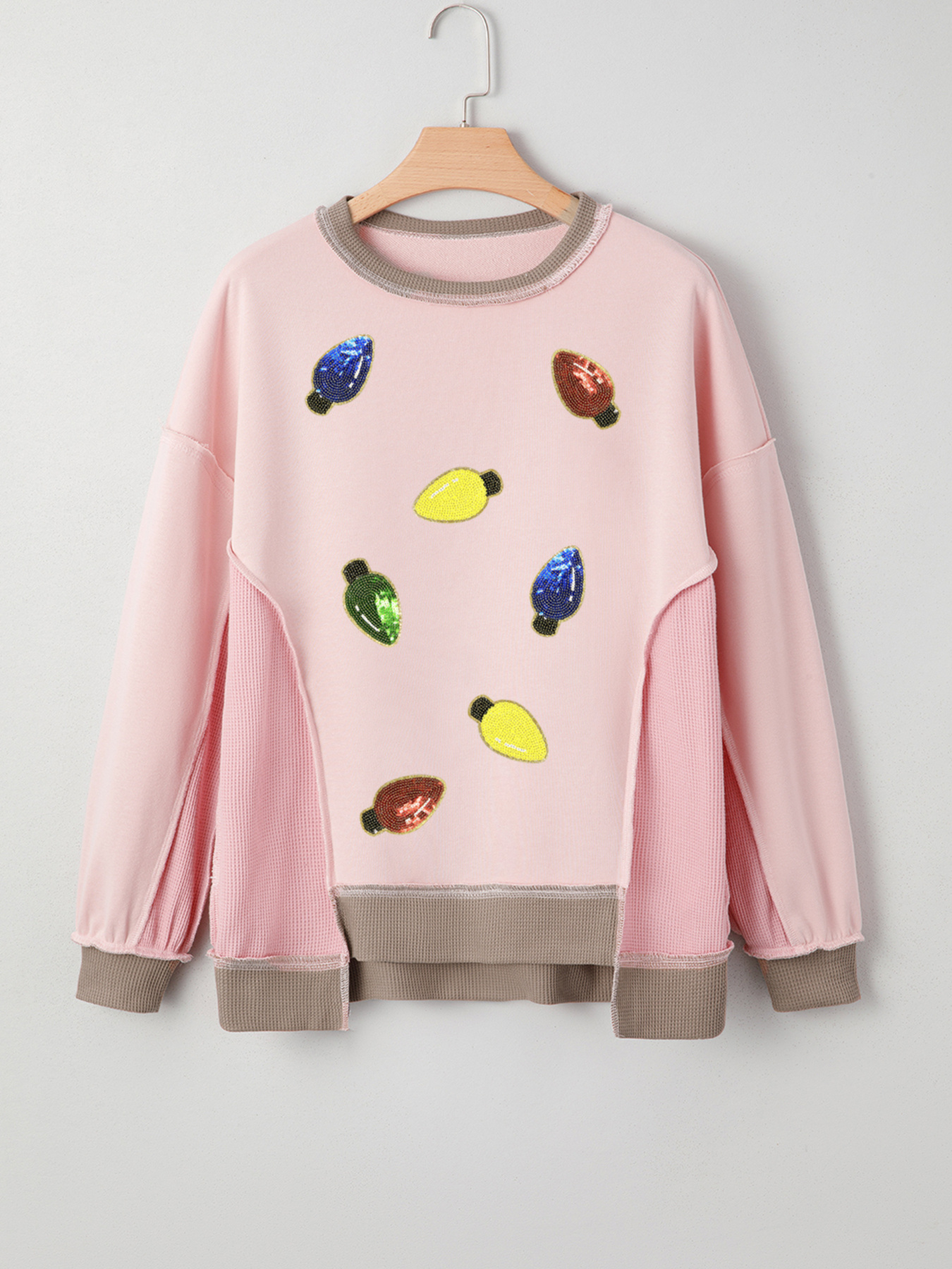 Waffle Color Block Patchwork Sequin Christmas Light Bulb Loose Sweatshirt
