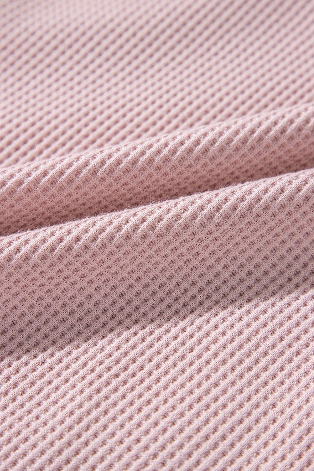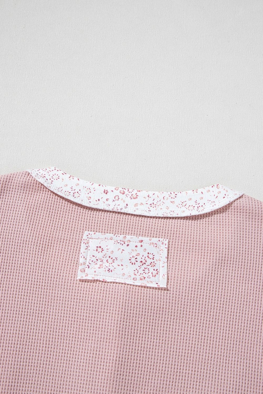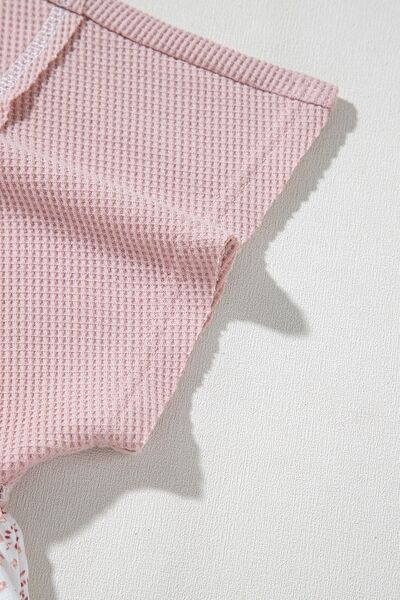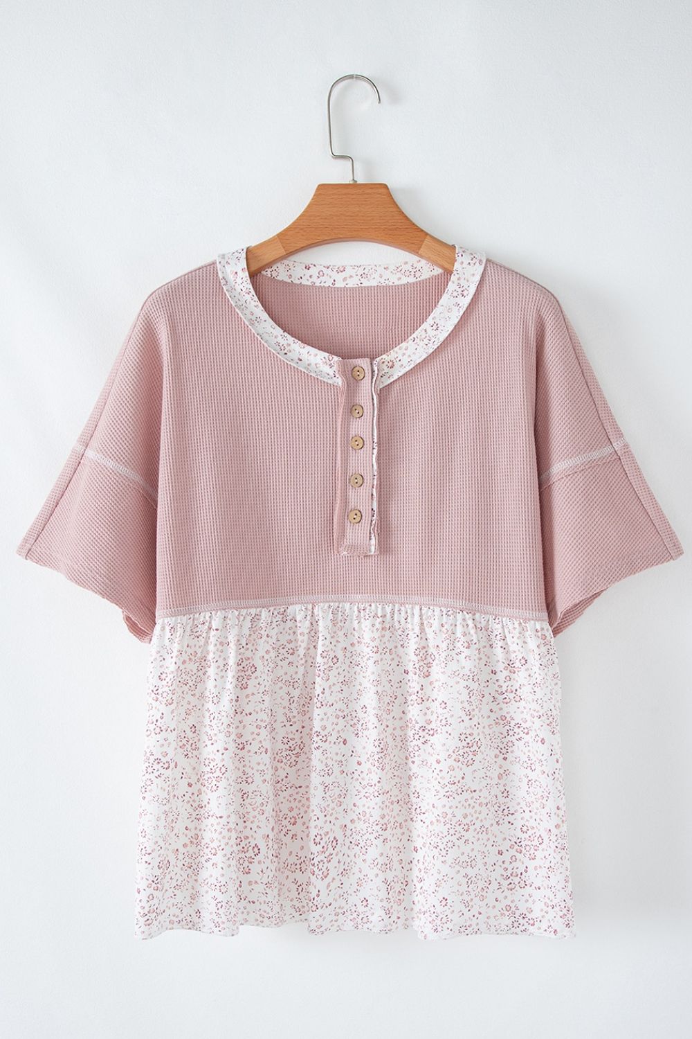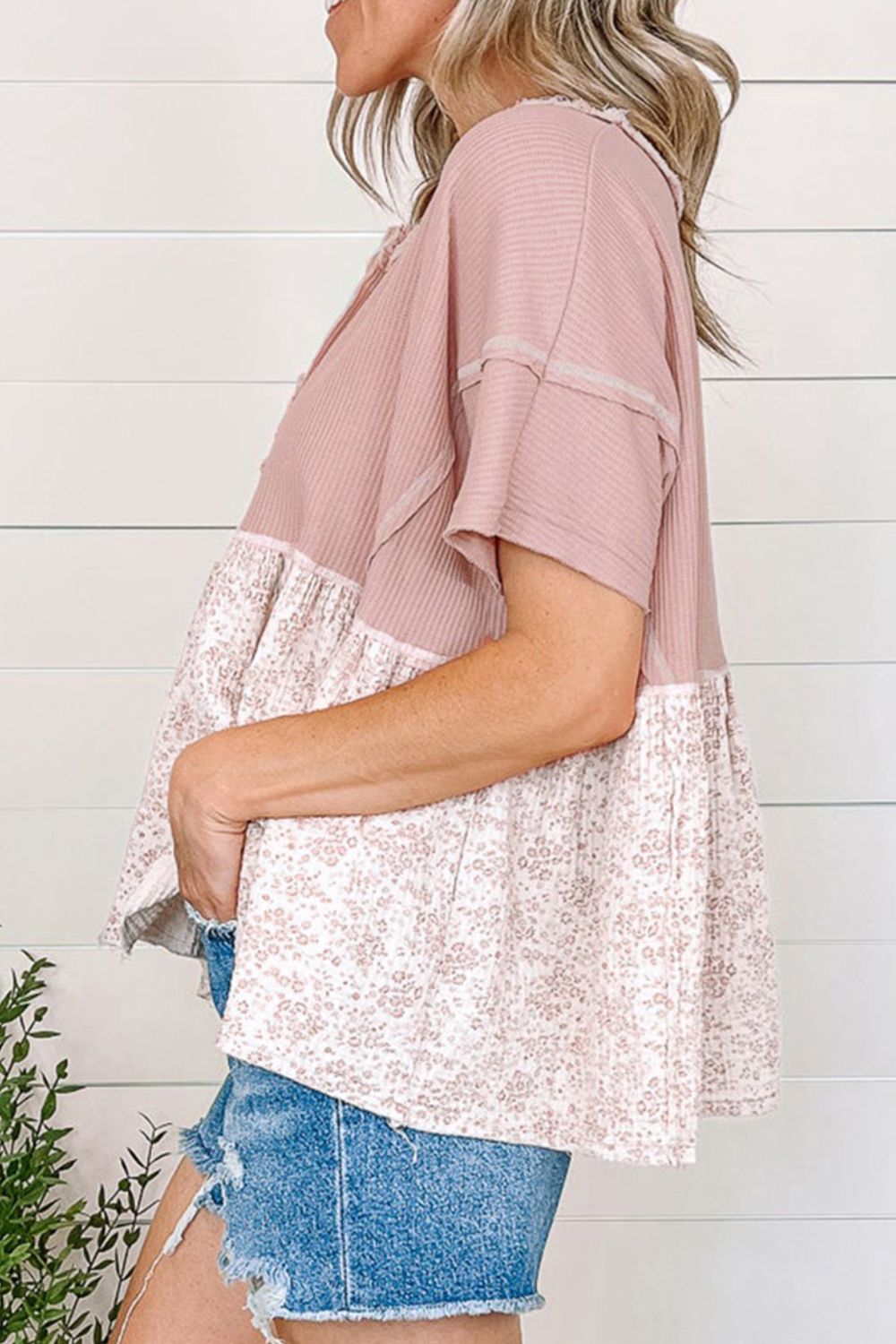 Waffle Floral Patchwork Exposed Seam Detail Short Sleeve Top