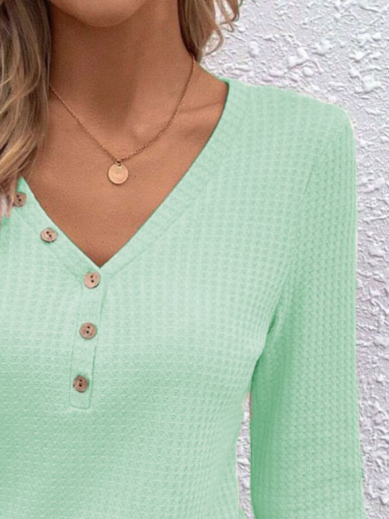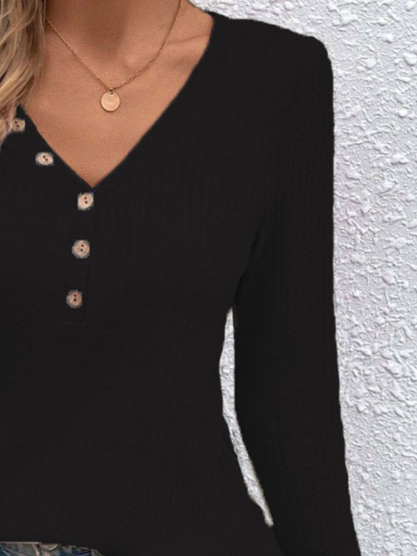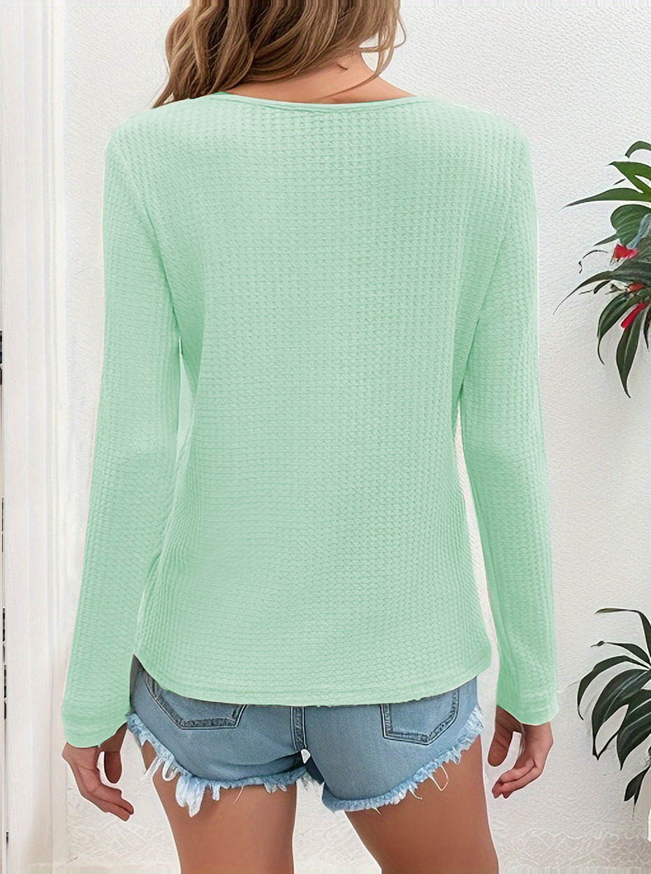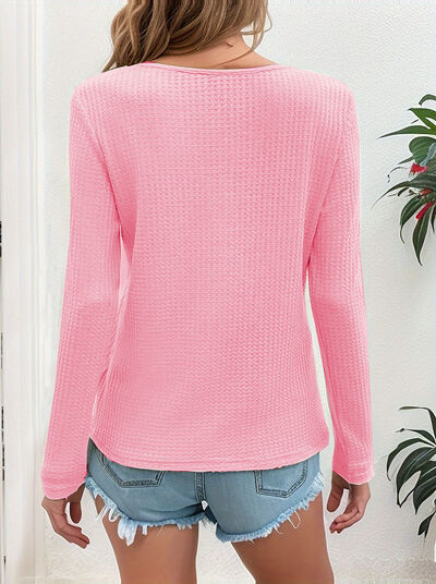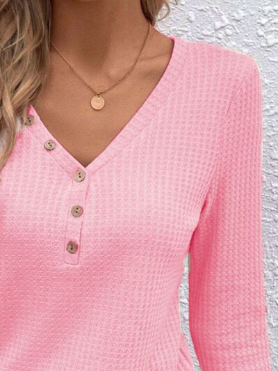 Waffle Knit Button-Detail V-Neck T-Shirt