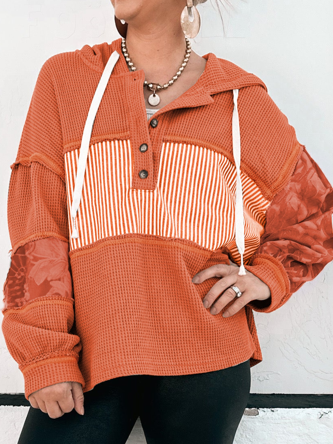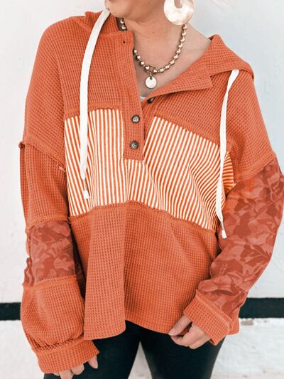 Waffle Knit Color Block Striped Drawstring Hoodie