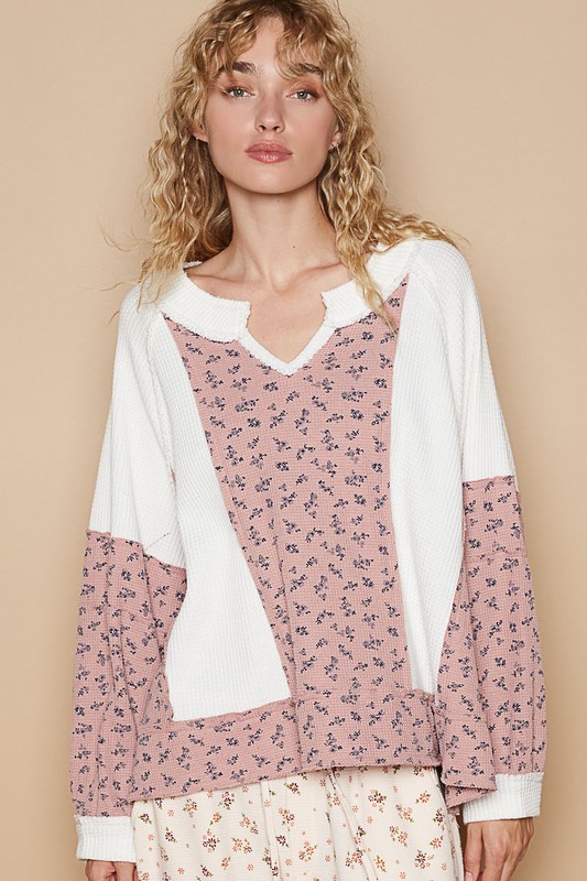 Waffle Knit Floral Notched Long Sleeve Top