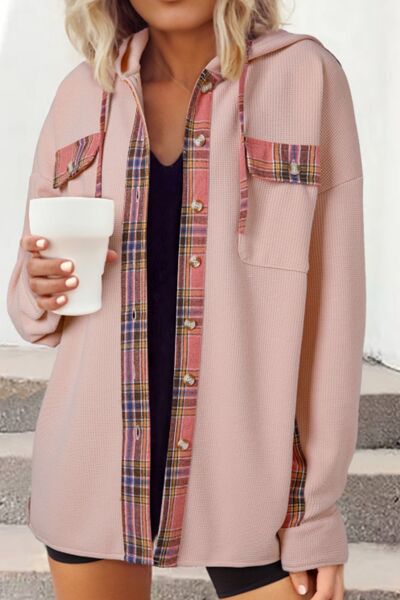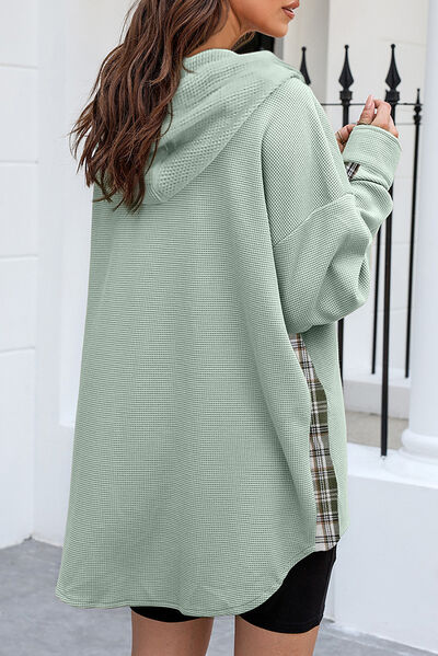 Waffle Knit Plaid Patchwork Drawstring Hooded Shacket