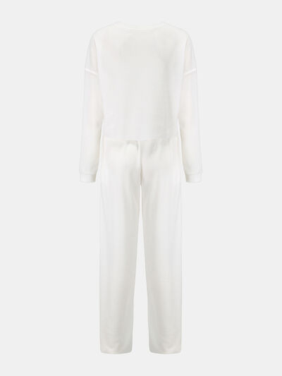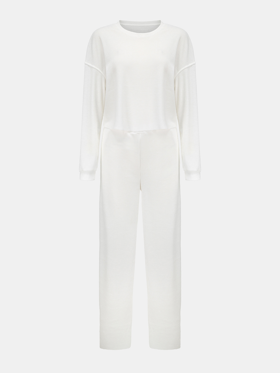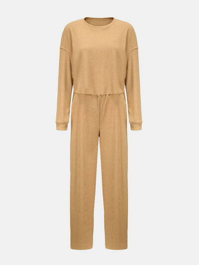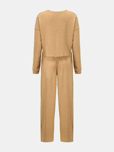 Waffle-Knit Round Neck Top and Pants Set