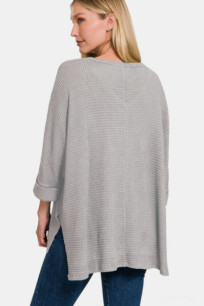 Waffle Knit V-Neck Long Sleeve Slit Top