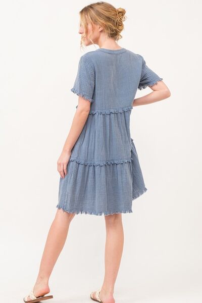Washed Frayed Detail Tiered Dress
