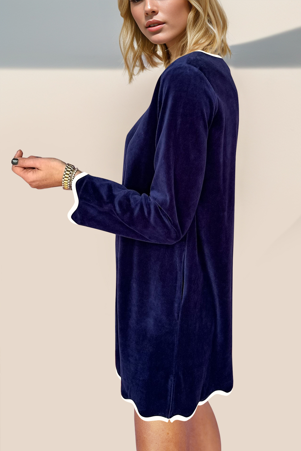 Wave Contrast Trim V-Neck Zip Up Long Sleeve Mini Dress