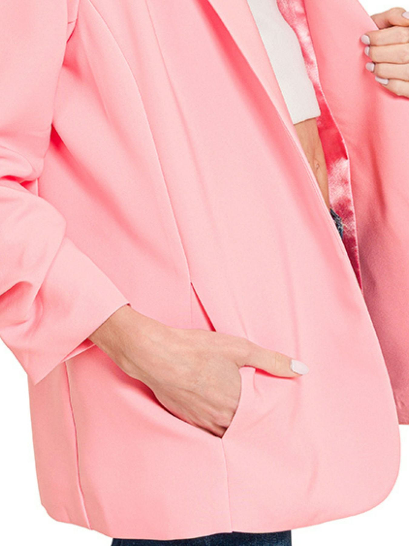 Woven 3/4 Ruched Sleeve Open Front Classic Blazer