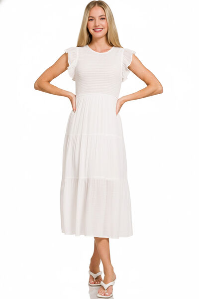 Woven Smocked Ruffle Sleeve Midi Dress