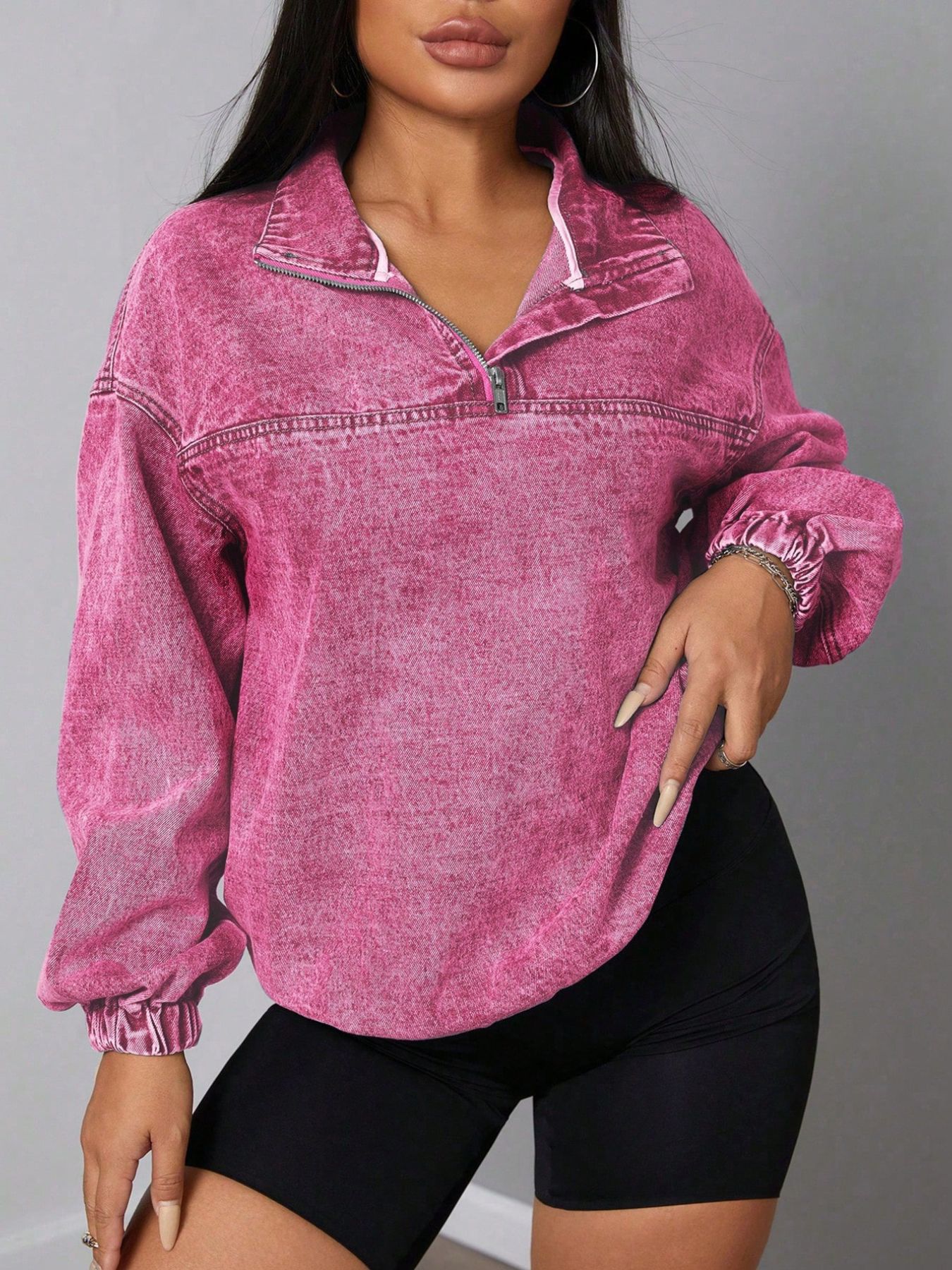 Zip Collar Long Sleeve Denim Top